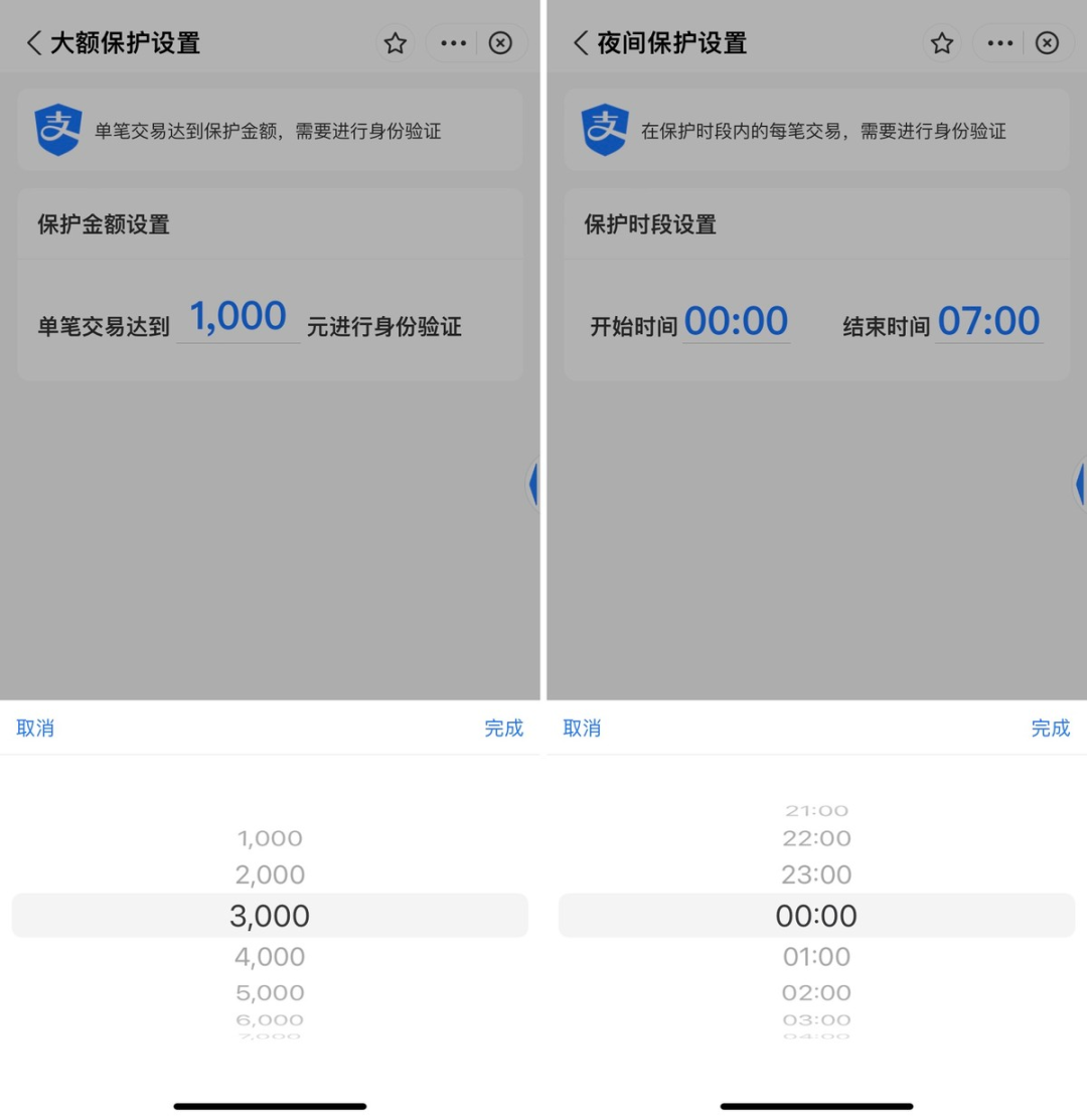 据了解,打开夜间保护功能后,在保护时段内的每笔交易,需再次进行身份验证,时间可设置 21:00 开始至次日早上 7:00 结束。而大额保护功能则是在单笔交易达到保护金额时,需进行身份验证,保护金额最低 1000 元,最高 10000 元。