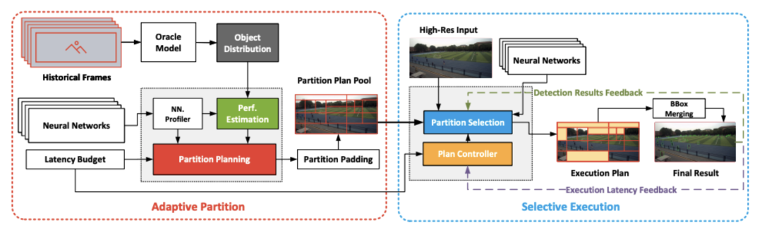 下面的示例简述了主要的设计思想。研究员们把图片分割成多个区域,对于蓝色区域,目标多且难以检测。因此需要分配更多算力,即用一个大模型来处理以保证检测成功率。对于绿色区域,目标少或容易检测,中小模型就可以保证准确率,且可以加速推理。对于红色区域,没有目标,可以直接跳过来进一步减少系统延迟。