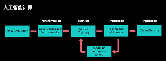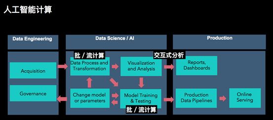 人工智能计算的种类很多,但是整体架构大多和上图所描述的类似。一个常见的ML pipeline通常涉及一系列的数据预处理、特征提取和转换、模型训练以及验证。如果验证后的效果符合预期,就可以将模型推到线上服务。如果不符合预期,算法工程师就需要调整算法模型或者参数,然后再做一次模型的训练和验证,直到对结果满意后,再将训练好的模型推上线服务。整个计算过程可以是对一个确定大小的数据按照批计算模式计算,也可以接入实时数据按照流计算模式进行计算。上面这个pipeline是人工智能计算最基础的流程,如果算法工程师对数据以及业务特点非常熟悉,他们就能设计出合理的算法模型和参数。但是往往更常见的情况是,算法工程师需要分析工具帮助他们理解数据。只有在很好地理解了数据特点之后,才能提取出更有用的特征,设计出更好的模型。因此,如下图所示,做好人工智能计算,不可或缺的一部分就是交互式分析。有了交互式分析,算法工程师可以对数据做各种ad-hoc query,从而帮助他们更好地理解数据。