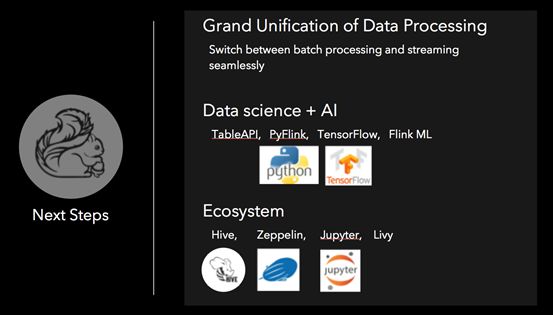 在易用性和生态方面,我们一方面帮助Flink社区在tableAPI,Python,以及ML等诸多领域发力,持续提升用户做Data science和AI计算的体验。另一方面,我们也在努力完善Flink和其他开源软件的融合,包括Hive,以及Notebook(Zeppelin, Jupyter)等等。这些诸多的努力,都是为了最终实现我们“一套引擎完美解决大数据智能计算”的初衷。Apache Flink自2014年开源至今也才4年,我们期待更多的企业和开发者们和我们一起参与到Apache Flink的社区和生态建设中来,共同把它打造成为全球最一流的开源大数据引擎。