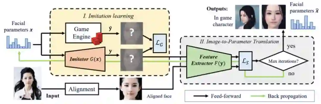 图 2:该方法的处理流程。模型包括模拟器 G(x) 和特征提取器 F (y)。前者模拟游戏引擎的行为,以用户定制的面部参数 x 为输入,生成「渲染后」的人脸图像 y。后者则决定了人脸相似性度量可以执行的特征空间,以搜索最优的面部参数集。