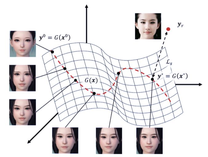 图 5:游戏角色自动创建可以看作是基于模拟器流形的搜索过程,旨在找出 y^∗ = G(x^∗) 的最优解,从而最小化 y 和参考人脸图像 y_r 在特征空间中的距离。