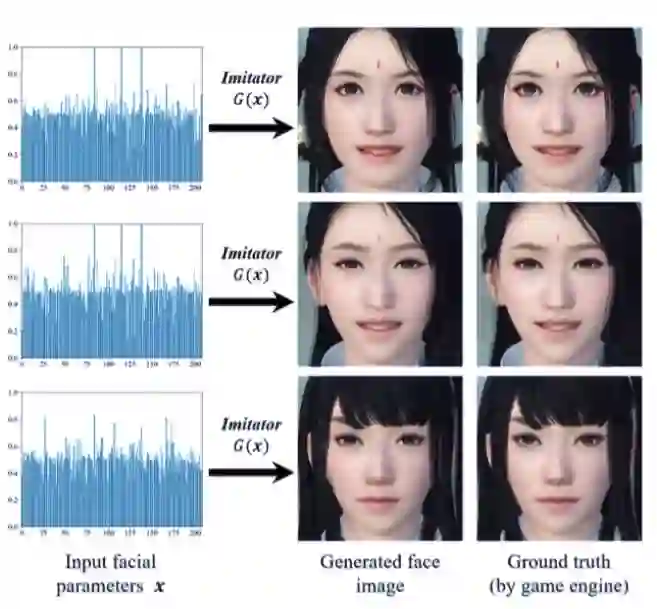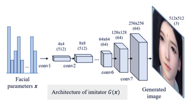 研究者训练了一个卷积神经网络作为模拟器,模拟游戏引擎的输入-输出关系,从而使得角色定制系统可微分。研究者在模拟器 G(x) 中使用了类似 DC-GAN 的网络配置,包括 8 个转置卷积层。出于简洁性的考虑,模拟器仅利用对应的人脸定制参数,拟合人脸模型的前视图。