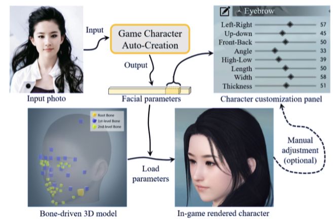 图 1:方法概览。该方法可基于输入人脸图像自动生成游戏角色,它基于人脸相似性度量和参数搜索机制(对大量具备物理意义的面部参数执行搜索)实现。之后用户可以根据需要自行微调生成游戏角色的面部参数。