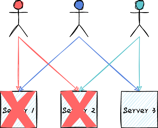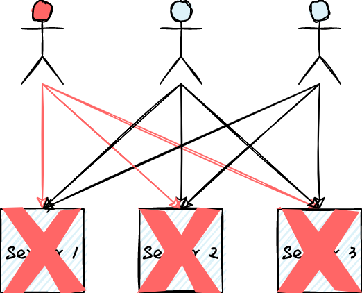 如下图所示,假设红色的用户被 DDoS 攻击或者他的某些请求可能触发服务器宕机的 bug,那么他的负载将可能打垮所有的服务器,造成整个服务不可用。