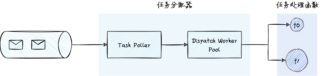 函数计算的任务分发采用了推模式,这样用户只需要专注于任务处理逻辑的开发,平台和用户的边界也很清晰。在推模式中,有一个任务分配器的角色,负责从任务队列拉取任务并分配到下游的任务处理实例上。任务分配器要能根据下游处理能力,自适应的调整任务分发速度。当用户的队列产生积压时,我们希望不断增加 dispatch worker pool 的任务分发能力;当达到下游处理能力的上限后,worker pool 要能感知到该状态,保持相对稳定的分发速度;当任务处理完毕后,work pool 要缩容,将分发能力释放给其他任务处理函数。