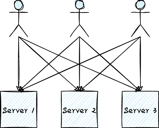 在一个多租环境中,防止“破坏者”对系统造成灾难性的破坏是系统设计的最大挑战。破坏者可能是被 DDoS 攻击的用户,或者在某些 corner case 下正好触发了系统 bug 的负载。下图展示了一种非常流行的架构,所有用户的流量以 round-robin 的方式均匀的发送给多台服务器。当所有用户的流量符合预期时,系统工作得很好,每台服务器的负载均匀,而且部分服务器宕机也不影响整体服务的可用性。但当出现“破坏者”后,系统的可用性将出现很大的风险。