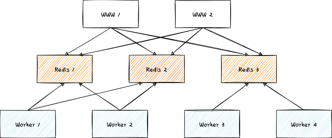 公司的异步任务处理系统架构。Worker 节点只和部分 Redis 实例相连。这解决了 worker 节点大规模扩展的能力,但是增加了调度和负载均衡的复杂度。