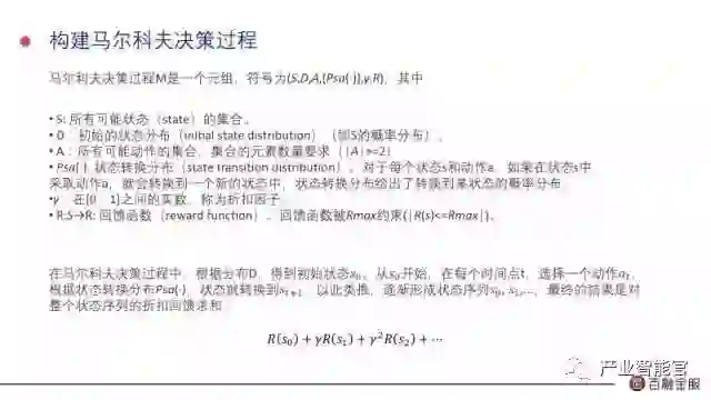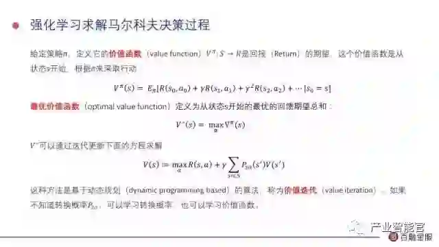 通过强化学习来求解马尔科夫决策过程。首先要定一个价格函数,其次就是你在不同时间段收回的钱,用折现因子折算到当前来看你的最大值,我们要求价值函数的最优点,这个算法是通过价值迭代来实现。