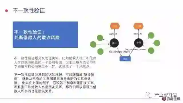 知识图谱相当于你要把人的经验做知识表示和推理,所以你要把经验固化成知识图谱,通过这些语义的运算来做反欺诈判断。我们通常把推理分为:不一致性验证;机构异常分析。