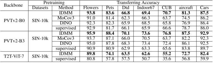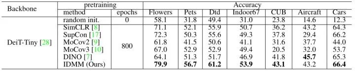 结果如下图3所示。即使从头开始训练,SSL 预处理也很有用,并且所有 SSL 方法的性能都优于随机初始化。IDMM 在所有这些数据集上都达到了最高的精度。当图像数量较少时 (例如花和宠物),IDMM 的优势更加明显。