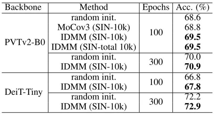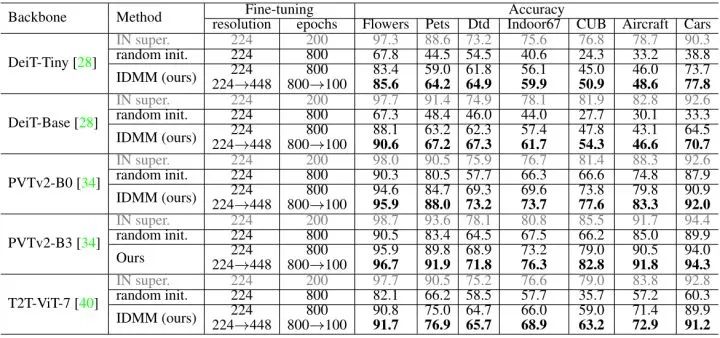 之后,作者又尝试了 Fine-tune 更长的 Epochs,以尝试获得更好的结果。之前的实验是在分辨率为224×224的情况下 Fine-tune 200 Epochs,现在改为在分辨率为224×224的情况下 Fine-tune 800 Epochs,并再在分辨率为448×448的情况下 Fine-tune 100 Epochs。结果如下图4所示。而且,IDMM 方法从头开始训练得到的性能和使用ImageNet 预训练模型的性能之间的差距已经大大缩小,这表明从头开始训练甚至对于 ViT 模型也是有希望的。