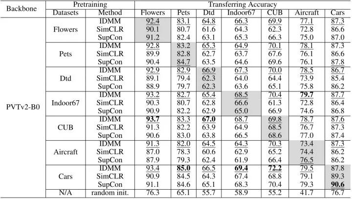 与 SimCLR 和 SupCon 相比,IDMM 在所有这些数据集上都具有更高的传输性能这可能要归功于可学习的全连接层 。
