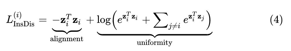 对比上式3和4不难发现都是有2项:alignment 和 uniformity,且结构相似。上式3和4的优化目标都是希望那些 positive pairs 之间的距离更接近些,negative pairs 之间的距离更远些。因此,作者得出结论,当设置 时,Instance discrimination Loss 近似等于 Contracstive learning Loss。