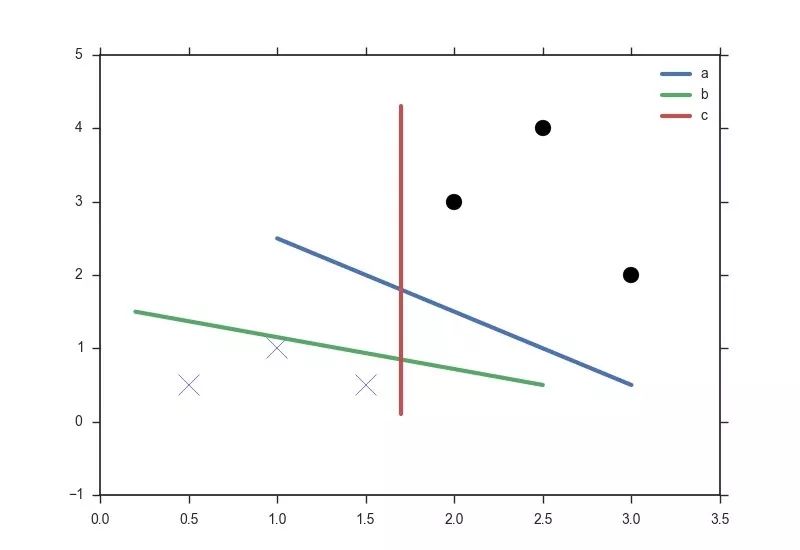 无论是a,b,c都无法完美地把两种数据区分出来,实际上也不存在一条直线能完全区分出两种数据,这种情况就是不可线性区分的,核函数或许可以帮我们解决这个问题。