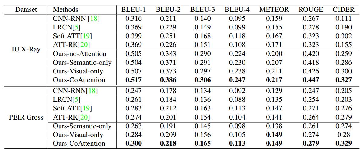 表 1. 模型在 IU X-Ray 数据集(上半 部分)上生成段落的主要结果,以及在 PEIR Gross 数据集(下半部分)上生成单语句的结果。BLUE-n 表示最多使用 n-grams 的 BLUE 分值。