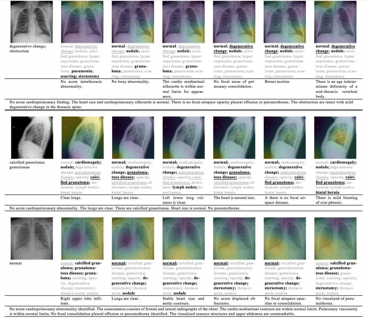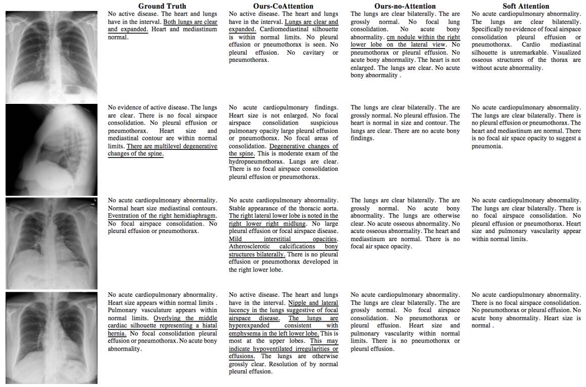 图 3. 协同注意力 、无注意力、软注意力模型生成的段落图示。划线句子是检测到异常情况的描述。第二个图是胸部侧面 x 光图像。前两个例子的结果是与真实报告相一致的,第三个出现了部分失败,最底下的图像完全失败。这些图像来自测试数据集