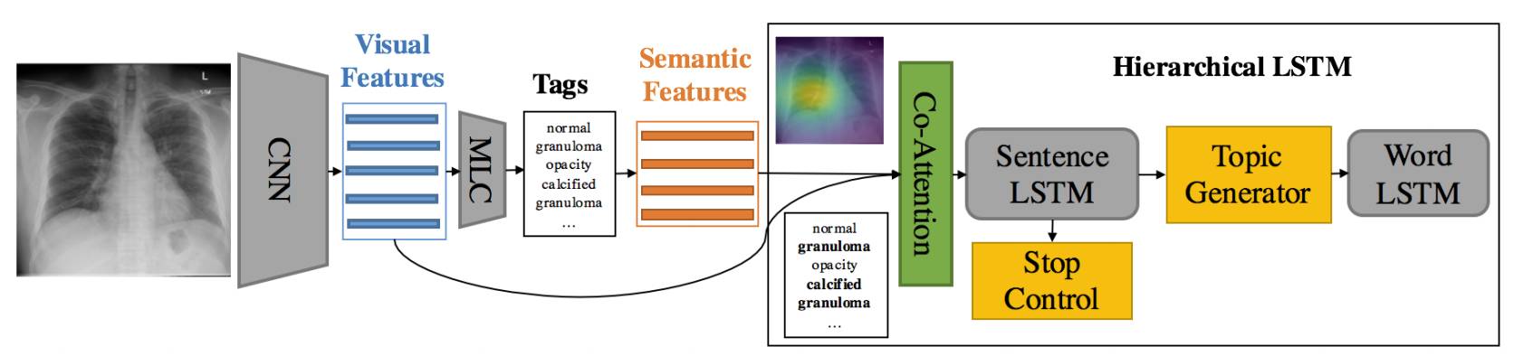 第二,医疗图像报告通常更注重叙述异常发现,因为这样能直接指出疾病、引导治疗。但如何定位图片中的病变区域并附上正确的描述非常困难。作者们解决该问题的方法是引入一种协同注意力机制(co-attention mechanism),它能同步关注图像和预测到的标签,并探索视觉与语义信息带来的协同效应。