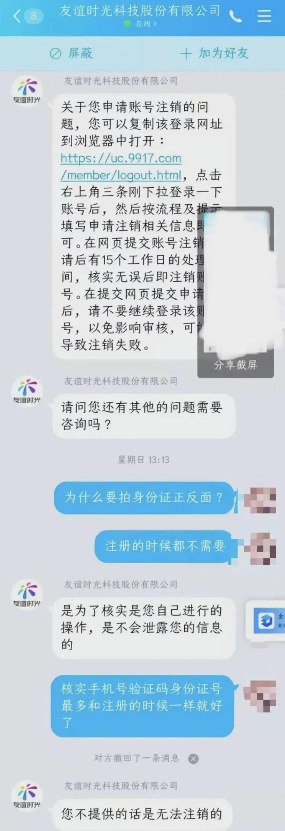 客服答复:“您不提供的话是无法注销的。”她找到微博上有同样经历的网友,对方用“好玩友”平台注销成功了,该平台和浮生为卿歌同属一家公司。