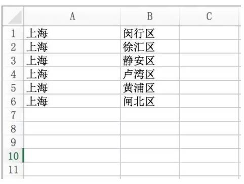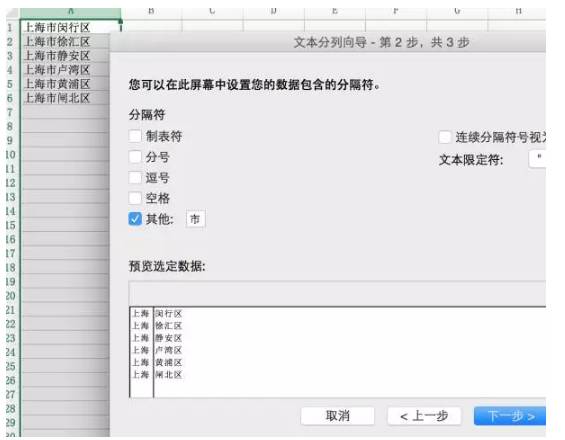 上文我有一列地区的数据,我想要将市和区分成两列。通常做法是可以用mid和find函数查找“市”截取字符。但最快做法就是用“市”分列。