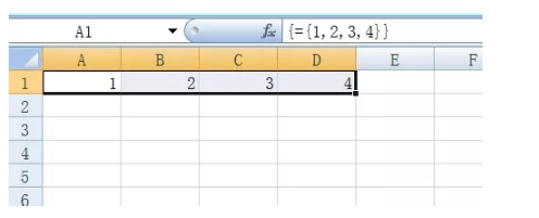 先看数组的最基础使用。选择A1:D1区域,输入={1,2,3,4}。记住是大括号。然后Ctrl+Shift+Enter。我们发现数组里的四个值被分别传到四个单元格中,这是数组的独有用法。