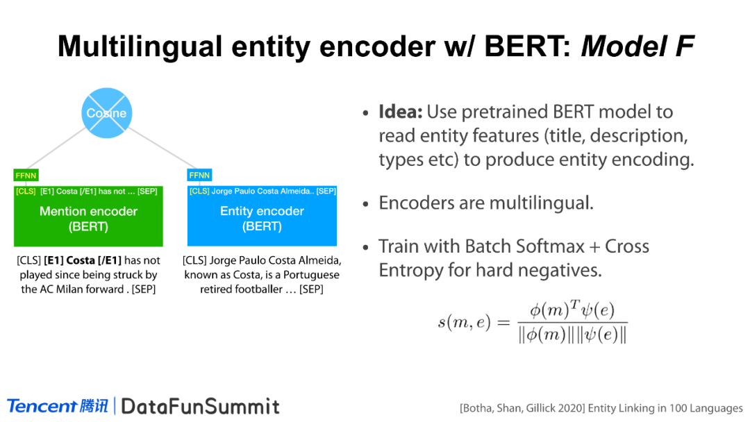 我们的答案是肯定的,并且思路也非常简单,就是说将RELIC模型中实体编码器换成基于BERT的实体编码器,进而去编码实体相关的文本特征。在训练模型的过程中,使得mention与实体的空间尽量相似。为什么该模型能够解决多语言的问题?这是因为我们可以使用多语言的预训练模型Multilingual Bert(简称mBERT)自动实现在多语言间的转换。在损失函数方面,我们使用了批量软最大化损失函数(Batch Softmax)以及基于负采样的交叉熵(Cross Entropy for hard negatives)损失。