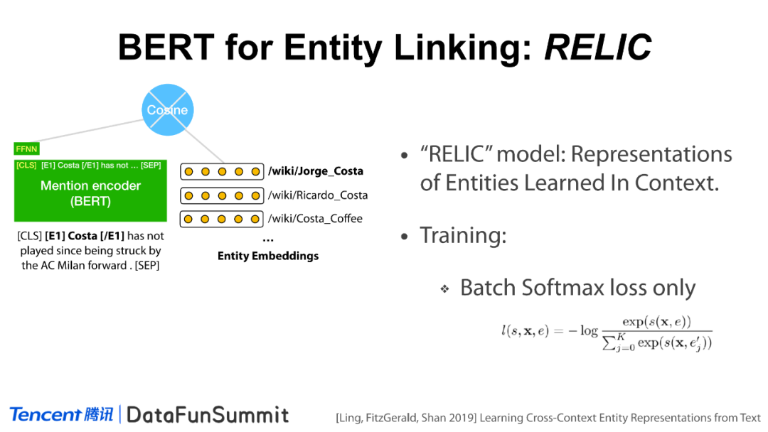 如上图,该模型的架构直观,也是一个双塔模型,左边是用BERT去编码mention所在的语境,右边是为实体学习其专有的嵌入表示。我们将这个方法称为RELIC(Representations of Entities Learned In Context),即从上下文语境中学习实体的表示。在训练模型时,我们使用的是批量软最大化损失函数(Batch Softmax loss)。
