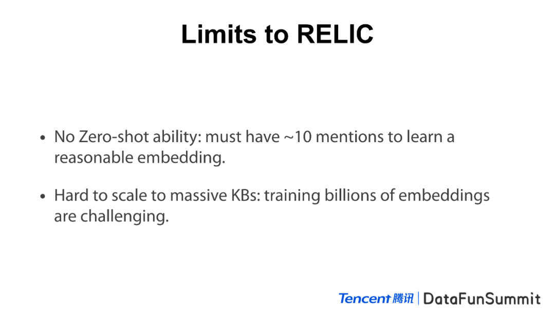 大多数方法对于词表的强依赖。即先要有mention到实体的映射,才能指导我们去做实体链接。例如在工业界,就需要我们不断去挖掘这样的词表映射关系,这样的过程总会有一定的错误。对于新实体(fresh entities)的响应也不会特别快;