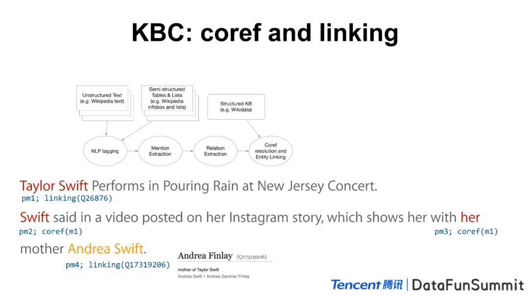 例如,通过指代消解,可以将上句话中的“Taylor Swift”、“Swift”和“her”指向同一个实体,这样做的好处在于:有利于在长文本中进行信息传递。这样,当我们抽取得到“her”和“Andrea Swift”两个实体,就可以将它们链接到正确的实体上。实体链接可以将上述这些提及链接到知识库对应的实体上。