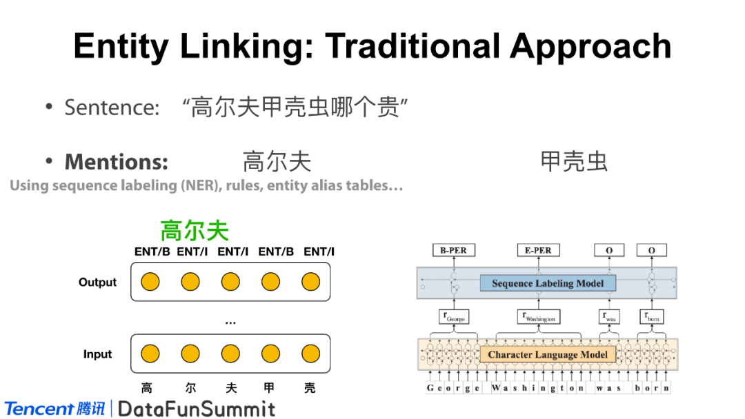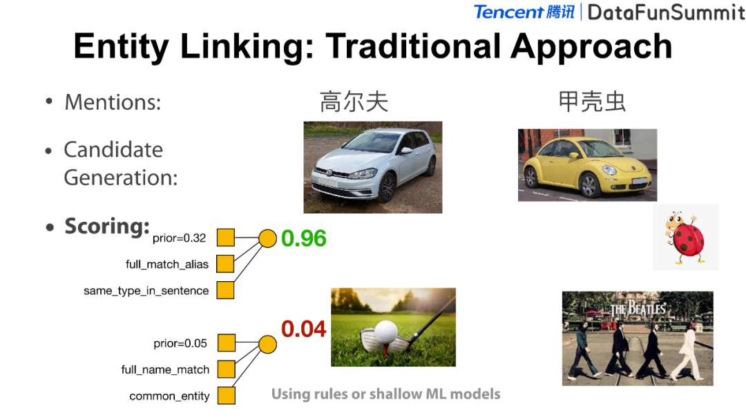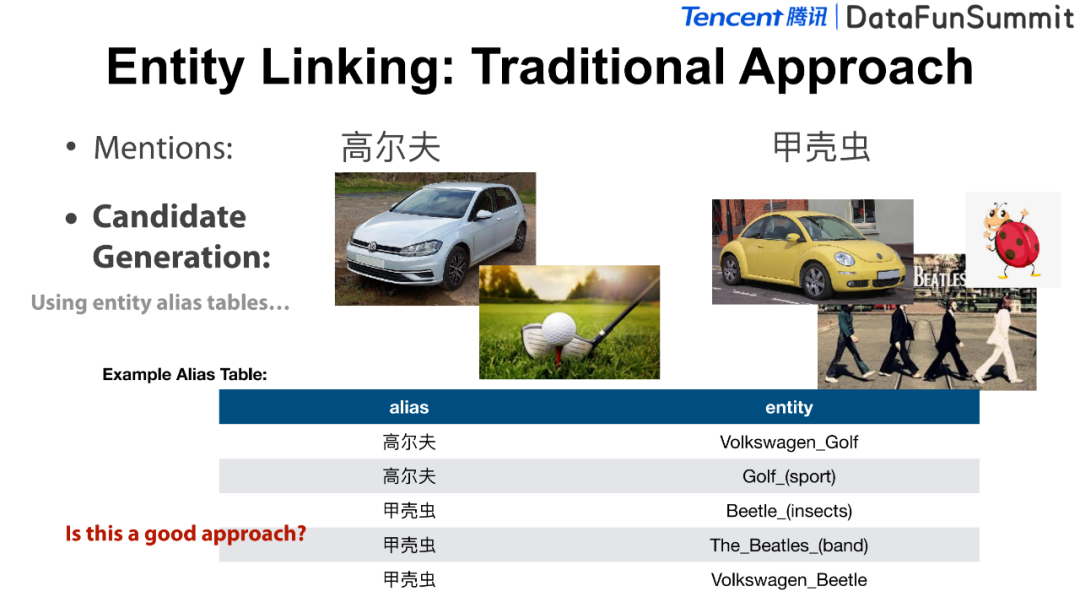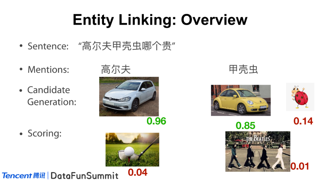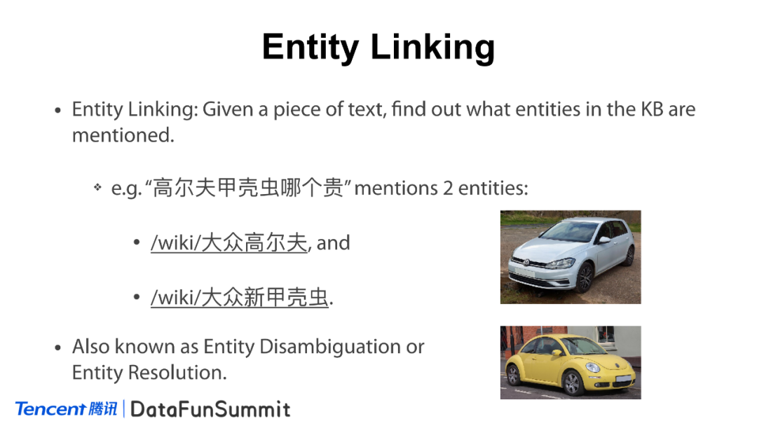 这里先给实体链接下一个定义:给定一段文本,并从中找出知识库中的实体。例如,从“高尔夫甲壳虫哪个贵”这句话中应该能识别出两个实体,即大众高尔夫(/wiki/大众高尔夫)和大众新甲壳虫(/wiki/大众新甲壳虫),这就是实体链接需要解决的问题。