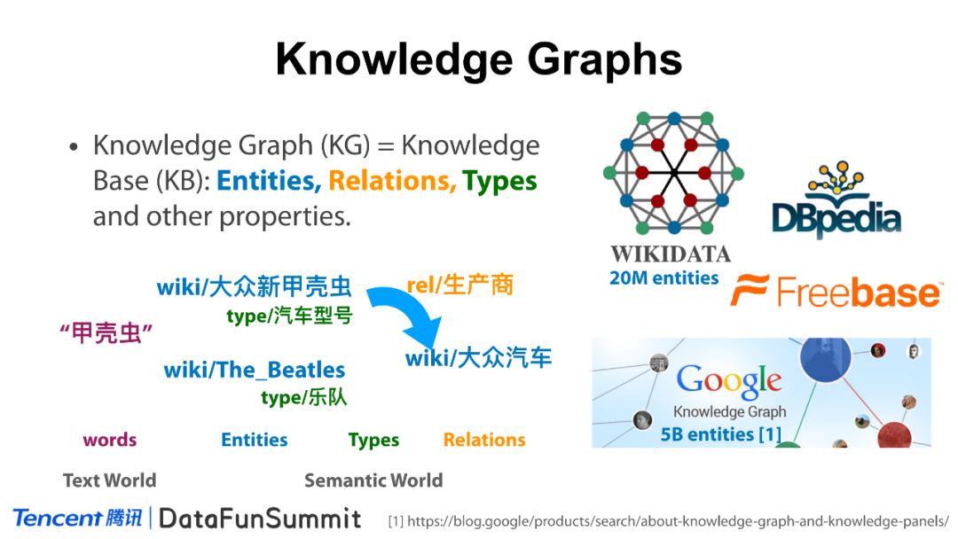 知识图谱(知识库,KG)是实体、关系、类型和其它一些属性的集合,我们可以用图结构去描述它。KG和文本的关系是什么?如上图,“甲壳虫”只是文本层面的一个表示,在知识库中,它可能就是实体层面的表示,例如“甲壳虫”既有可能是一种昆虫,又有可能是一种汽车,也有可能是一种乐队。实体之间是有关系的,例如“大众新甲壳虫”和“大众汽车”之间有一种“生产商”的关系。知识图谱中同样有类别信息,例如“大众新甲壳虫”可能是一种汽车型号;“The_Beatles”可能是一个乐队等。所以说,知识图谱是一种异构的,有多种实体、关系和属性的图结构。“甲壳虫”是在文本世界(Text World)中的一种表示;实体、关系、类型、属性是在语义世界(Semantic World)中的表示。有很多重要且有趣的工作是将这里的文本世界与语义世界进行打通。常见的公开知识图谱有Wikidata(包含2千万左右的实体)、DBpedia、Freebase、Google Knowledge Graph(包含50亿左右的实体)等。当然,我们现在也有很多的中文知识图谱,例如CN-DBpedia、大词林等等。
