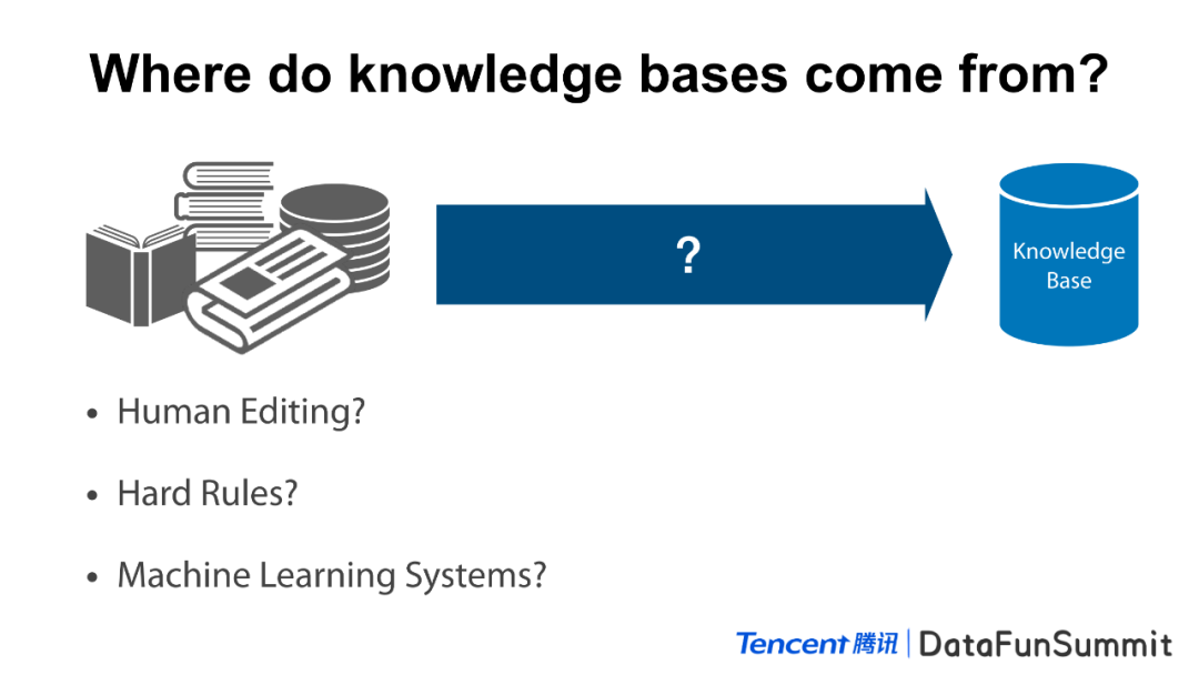 早期的大多数知识库是由人工进行标注的,例如医疗领域的知识库。然后,逐渐过渡到一些规则的方法。近些年来,研究者们普遍采用机器学习的方法和系统去完成知识的抽取以及知识库的构建。
