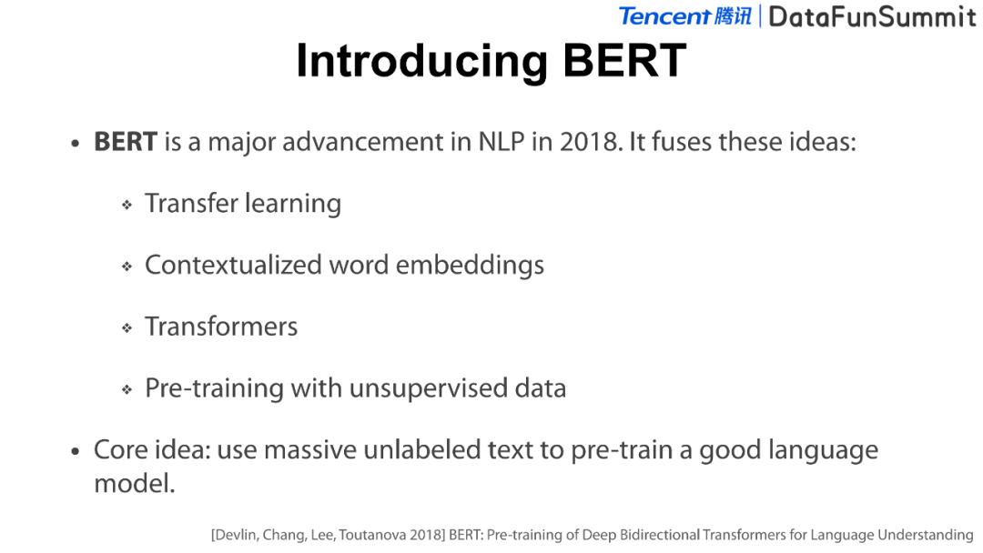 为了改进上述模型,我们不得不提到预训练语言模型BERT,BERT于2018年提出,对迁移学习(Transfer learning)、语境中的词嵌入(Contextualized word embeddings)、Transformer架构(Transformers)、大规模无监督预料下的预训练(Pre-training with unsupervised data)这几个概念进行了较好的融合。BERT的核心思想在于:能够运用大规模的无标注文本语料去预训练一个好的语言模型,又能够迁移到很多下游任务当中。