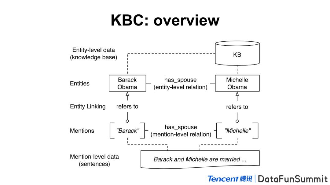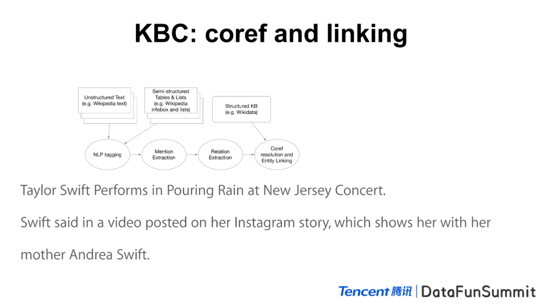 上图只是知识库构建过程中的一个核心部分,包含了从句子数据中去抽取mentions,即命名实体识别、mention之间的关系抽取,以及实体链接。然后,把实体之间的关系输入到知识库中,生成新的三元组。当然还有更多的技术,如实体发现、实体对齐等,它们并没有在这张图中进行展示。
