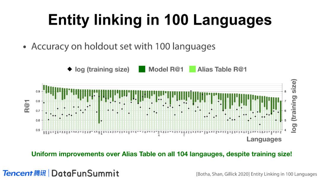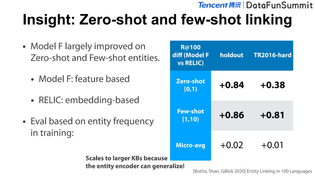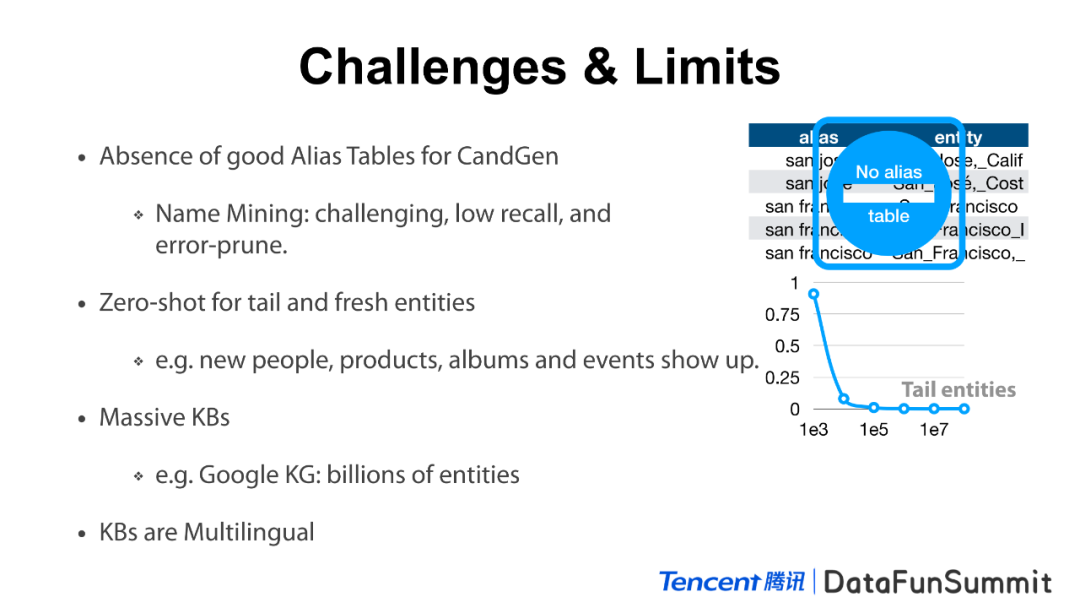 另外一个挑战就是对于少样本尾部实体的链接。有些模型对头部实体的表现会比较好,然而每天都会有新的人物、产品、专辑以及事件会出现,对于这些新的实体,是否能有效地进行链接;