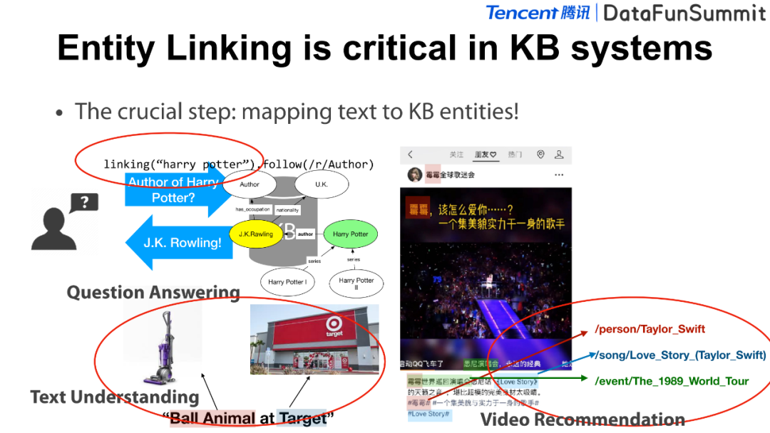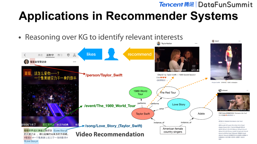如上图所示,通过挖掘用户点过“赞”的视频,这个视频有其文本描述信息,如果能将这些文本中准确地映射到知识库中,例如,这里的“霉霉”其实是说泰勒·斯威夫特(女歌手)(/person/Taylor_Swift),“世界巡回演唱会”指的是1989年的World_Tour(/event/The_1989_World_Tour),“Love Story”是她的一首歌(/song/Love_Story_(Taylor_Swift))等等。如果能够发现这些文本与实体之间的关联,那么我们就能在相应的知识图谱上做一定的扩展。例如,我们可以给用户推荐泰勒·斯威夫特的其它演唱会的视频,以及与她相似的其它歌手的视频等等。如此,这个推荐系统就具有比较好的多样性与可解释性。上述为一个简单的应用思路,近期也有很多论文探索知识图谱在推荐中的应用,大家感兴趣的话可以去阅读。