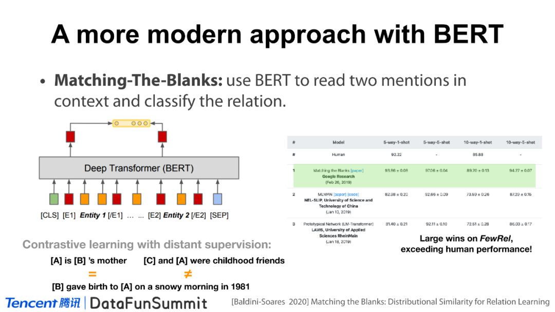 这里讲一个在关系抽取任务上比较新的方法,被称为Matching-The-Blanks。主要是对一句话中的两个提及进行关系分类,我们用BERT去编码这两个提及所在的语境,然后使用实体的嵌入表示进行分类。在该文中,用到了基于远程监督的对比学习(contrastive learning with distant supervision),例如在上图的例子中,通过阅读包含实体A和实体B的两句话,以及包含实体A和实体C的一句话,让模型去判别哪两句话表示的同一种关系。感兴趣的朋友们可以去阅读《Matching the Blanks: Distributional Similarity for Relation Learning》这篇文章。这项工作是当前小样本关系抽取任务的最好结果,甚至比人工的分类性能还高。