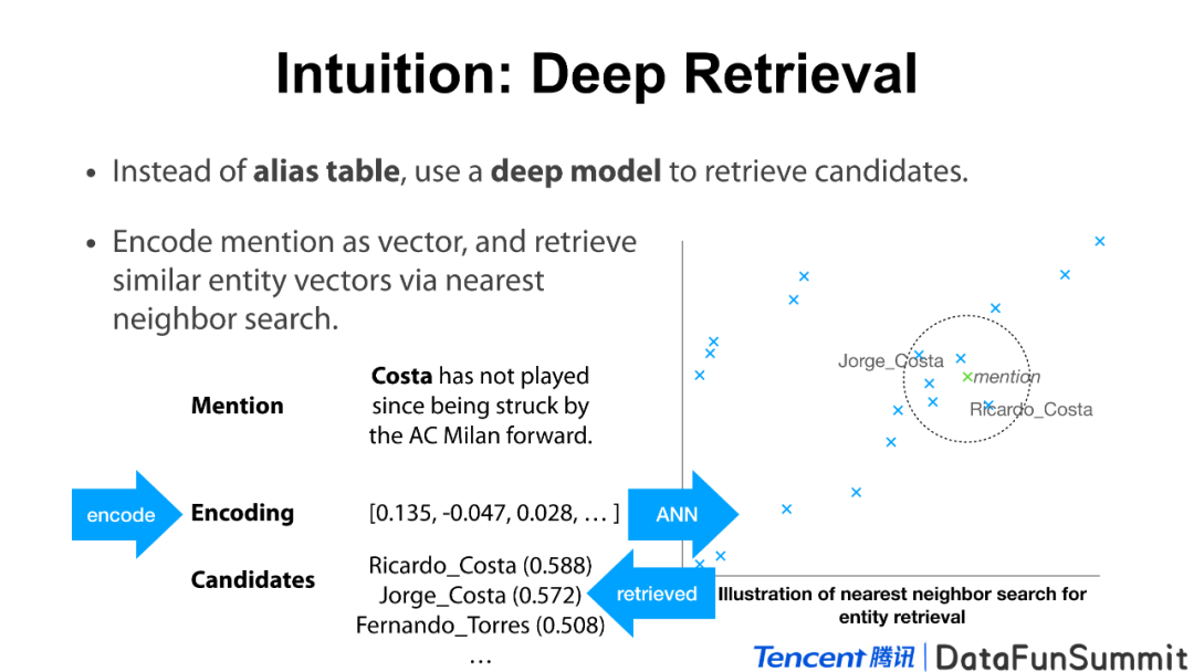 要减轻实体链接对词表的依赖,一个有效的方法被称为:深度召回(Deep Retrieval)。该方法的主要思路是,不在依赖于这种词表,我们可通过深度学习模型学习到这样的映射,然后将最有可能的实体候选项作为该模型的结果进行召回。具体的做法是,将语境中的实体词当成是向量表示,然后在向量空间中进行检索,找到与它最近的候选项。这里举个例子,如上图,在“Costa has not played since being struck by the AC Milan forward(Costa在AC米兰这场比赛后就再没有打过了).”这句话中,我们将这句话编码为一个向量[0.135, -0.047, 0.028, …],然后在一个向量空间中搜索,从图中可知,mention的向量附近的往往就是一些很匹配的实体(如Jorge_Costa, Ricardo_Costa等)。最后召回的结果中排名第一的就是Ricardo_Costa,即为链接的正确答案。