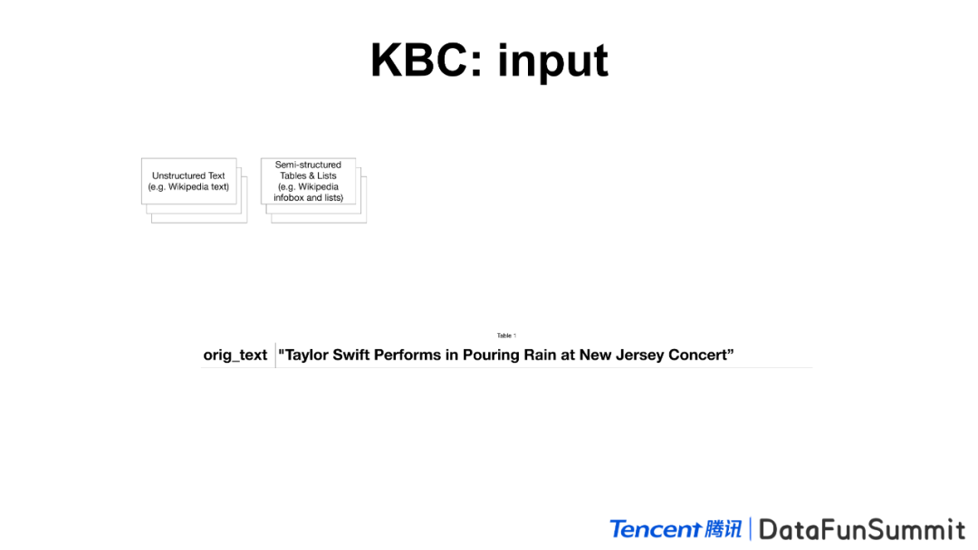 知识库的数据源一般为无结构化的文本,半结构化的表格、列表等。我们以无结构化的文本为例,输入的文本为:“Taylor Swift Performs in Pouring Rain at New Jersey Concert (Taylor Swift在倾盆大雨的新泽西举办了音乐会)”。