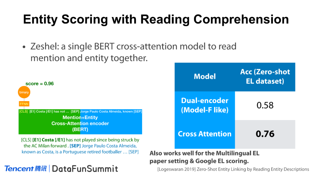 对于上述问题,目前较为有效的仍是基于阅读理解的方法(请见《Zero-Shot Entity Linking by Reading Entity Descriptions》)。如上图所示,该方法的思路非常直观,即通过BERT去编码mention和实体描述拼接好的一段文本,与RELIC双塔模型的区别在于,通过交叉注意力机制(cross-attention)可对mention和实体描述进行横向地比较,故比基于ID表示的模型更有表达力。在实验中我们发现,该方法相较于双编码器的方法(dual-encoder)实现了较大的性能提升。为什么称为Zero-Shot呢?这是因为只要有实体的描述信息,就可以将其与实体的mention相互比较,而不需要依赖大量的数据。在上述工作中,作者也发布了一个零样本实体链接的数据集。