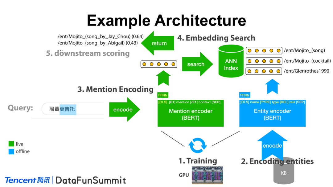 怎么样去实现这样一个架构呢?简单来说,我们去训练这样一个双塔模型,使用实体编码器去编码实体描述,并把其放在一个最近邻搜索的索引空间中。当一个查询(query)来临,如“周董莫吉托”,该模型将其编码为实体向量,然后在最近邻索引空间中去检索,这样相应的实体就会被召回。