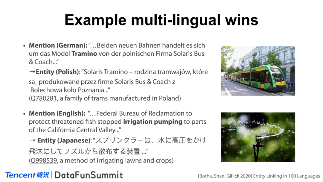 以下,我们再举几个例子让大家获得更直观的感受。一个例子是,用波兰语对小火车进行描述,它被进口到了德国并有一篇对其进行描述的文章。我们希望将“Tramino”这个词链接到波兰语的相关实体上,这是一个成功的例子。另一个例子是,有一段关于喷灌洒水装置的日语描述以及一段英文描述,我们可以借助于“喷灌洒水装置”这个词实现这两段文本之间的相互链接。由此可以发现,我们的模型对于跨语言实体链接是效果的。