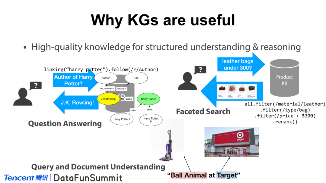 为什么说知识图谱是有用的呢?知识图谱中涵盖的高质量的知识可以帮助我们进行理解与推理。如上图,我们举几个例子:在智能问答(Question Answering)方面,一般用户会有一个问题(query),例如《哈利波特》一书的作者是谁(Author of Harry Potter)?怎么进行解答呢?我们首先会将这个问题做成一个结构化的查询语句。然后将这个语句在知识库上进行执行,我们会发现J.K.Rawling这个节点和Harry Potter这个节点之间存在作者关系(author),所以就能回答这个知识导向的问题。在结构化搜索(Faceted Search)中,用户可能会有一些复杂的问题,例如“我要去买300元以下的皮包”,机器可以解析到这句话本质是个限定化的搜索,如它的材质是皮、商品种类是包,价格是300元以下等,那么我们在商品的知识库中进行搜索,可返回给用户一些最满足上述条件的商品。知识图谱还能帮助我们做问题与文本语义的理解(Query and Document Understanding)。例如,这句话“Ball Animal at Target”是什么意思呢?对此,有的系统可能会很迷惑,但是如果有知识图谱来辅助理解,就可以发现“Ball Animal”是一个戴森吸尘器的型号,“Target”是美国的一个连锁商场。这些词其实都是有歧义的,但是只要能和知识图谱进行准确的关联,那么我们就会得知:其实用户是想要在Target购买吸尘器。