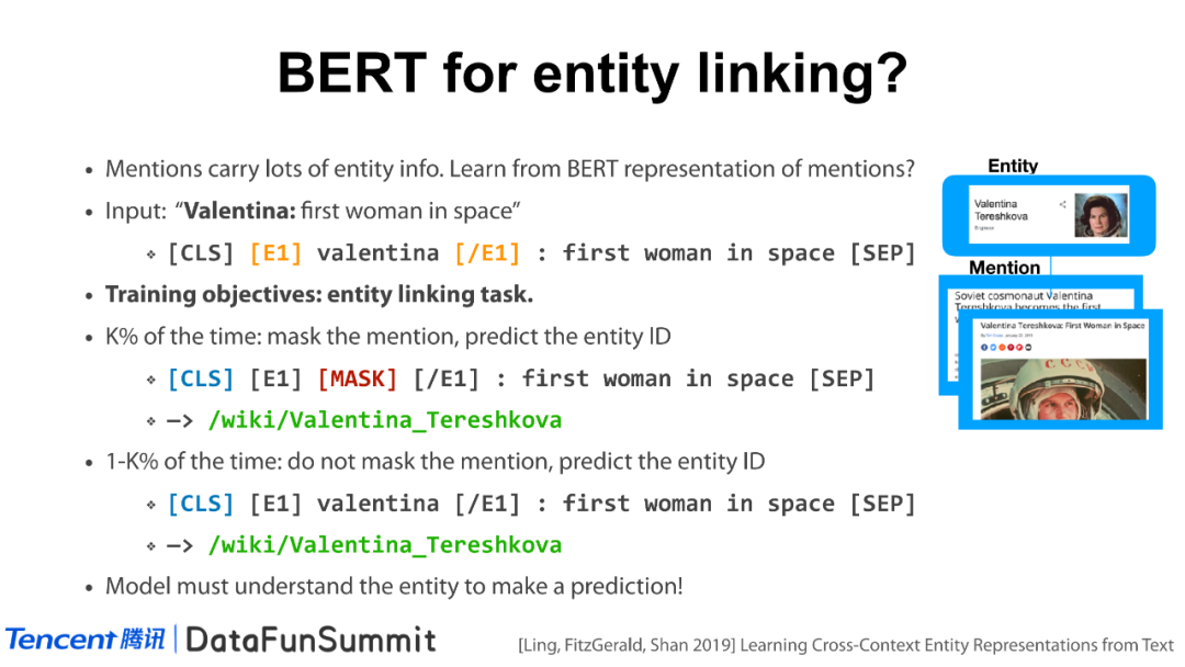 我们能否将BERT用于实体链接的任务呢?答案是肯定的。主要的建模思路是,像在维基百科这样大规模的知识图谱或文本语料中,往往会有大量的内链,其所在语境蕴含了很多语义信息,而BERT能够较好地获取无结构文本中的语义信息。因此,我们想是否能从mention的上下文中学习完成实体的嵌入表示。以上图为例,对于句子“Valentian: first woman in space(Valentian是第一个登上太空的女性).”,我们的模型能够根据Valentian这个实体学到一些新的知识,所以我们设计了一个实体链接的任务,即根据mention所在的语境去预测它指的是哪一个实体。其中,我们设计了一个masking策略,即在一定的时候把整个mention替换为一个[MASK],在其它的时候就不去替换。采用了这样的训练任务后,模型会学习到语境中的语义信息以及提及对应的实体嵌入表示,具体请见《Learning Cross-Context Entity Representations from Text》。