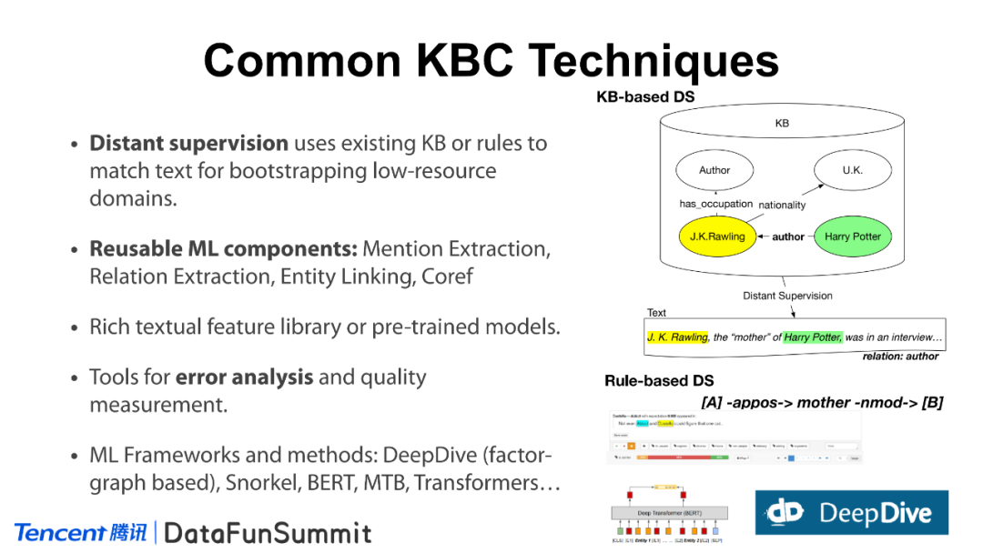 在常用的知识库构建技术中,远程监督(或称为弱监督学习)一般的思路是,利用已有的知识库,一系列文本匹配的规则,语境模板等快速地在文本中去构建训练样本。尤其是在低资源、垂直领域的环境下,普遍采用这种方法,这样可以有效地降低人工标注训练样本的成本。在知识库的构建过程中,常用的组件有:指称项抽取(mention extraction)、关系抽取(relation extraction)、实体链接(entity linking)、指代消解(Coref) 等共性的机器学习组件。当然,工具也是很重要的,在领域上我们需要对模型进行迭代,对于某一版模型的抽取结果而言,我们需要对其进行分析并明确改进的地方。最后是机器学习的框架和方法,例如DeepDive(一个基于概率图模型的工具),Snorkel,BERT,MTB,Transformers等。
