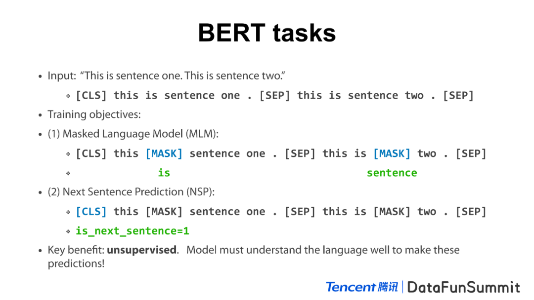 由于大家对BERT都有相当的认识,因此我就不再赘述相关的基础知识。但在这里,我主要想讲一下BERT的两个任务,一个是遮蔽语言模型(masked language model, MLM),一个是下一句子预测(next sentence prediction, NSP)。第一个任务很像完形填空,即将一个句子的一个词盖住,让模型去预测盖住的位置是哪一个词;第二个任务是预测当前的两个句子是否为上下句关系。这样的好处是,我们可以利用无监督的语料去做预训练。介绍上述两个任务的目的是为将它们应用于后续的实体链接任务做铺垫。