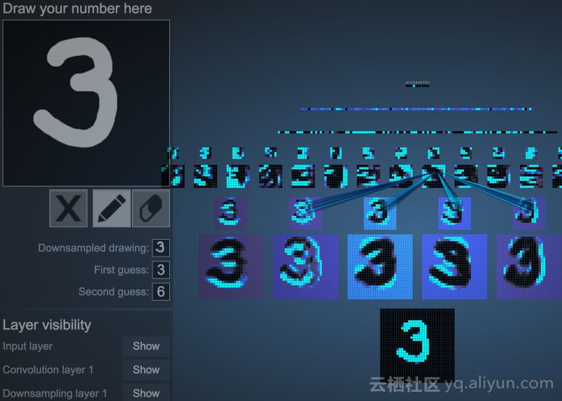 是不是很酷?该视频显示每个层变得更简单,而不是变得更复杂。就像函数将数据分解成较小的部分一样,以抽象的概念结束。你可以在该网站(Adam Harley)与此流程进行交互。