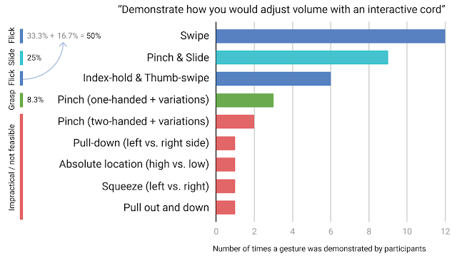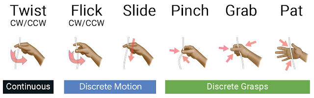 我们开展了手势触发调查,发现了扩展手势集的机会。受这些结果的启发,我们决定研究五种动作手势,包括轻弹和滑动,以及单点触摸手势(捏、抓和拍)。