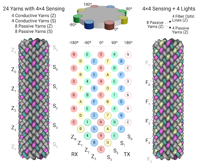 左:基于 4×4 线状编织物(核心四周围绕了 8 根导电线)的螺旋感应矩阵。洋红色/蓝绿色的是导电纱线,发挥接收/传输作用。灰色的是纱线(棉质);中:矩阵横截面图,展示了无数个 4×4 矩阵 (彩色圆圈 0-F),这种模式在整条细绳上重复;右:黄色的是光纤线,负责提供视觉反馈