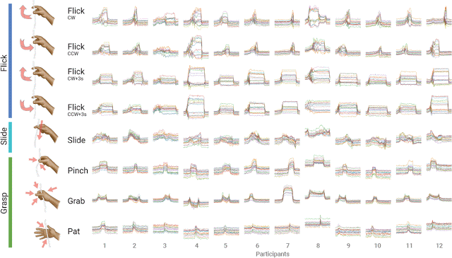这里值得注意的是,重复传感矩阵中的内在关系非常适用于机器学习分类。我们研究中使用的 ML 分类器可对有限数据进行快速训练,使依赖于用户的交互系统具备可行性。根据我们的经验,训练典型手势所花的时间不到 30 秒,这相当于训练指纹传感器所需的时间。